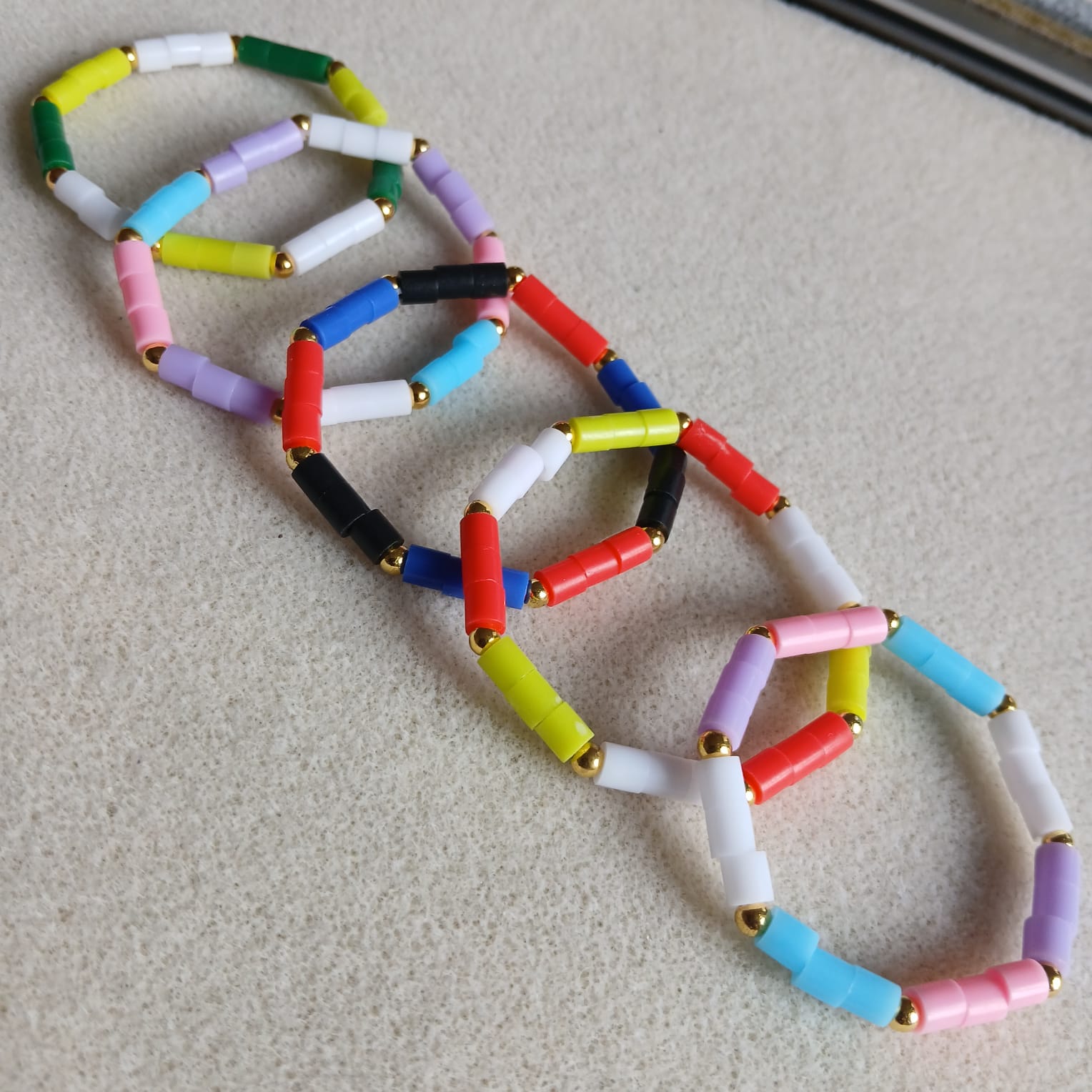 Náramky pro slečny k letnímu outfitu v různých pastelových barvách od bílé, červené, žluté …. až po černou. Mezi každými třemi korálky z polyetylenu je navlečen zlatý korálek, velikosti 4mm. Celý náramek je navlečen na gumičce. Všechny barvy jsou na fotografii.