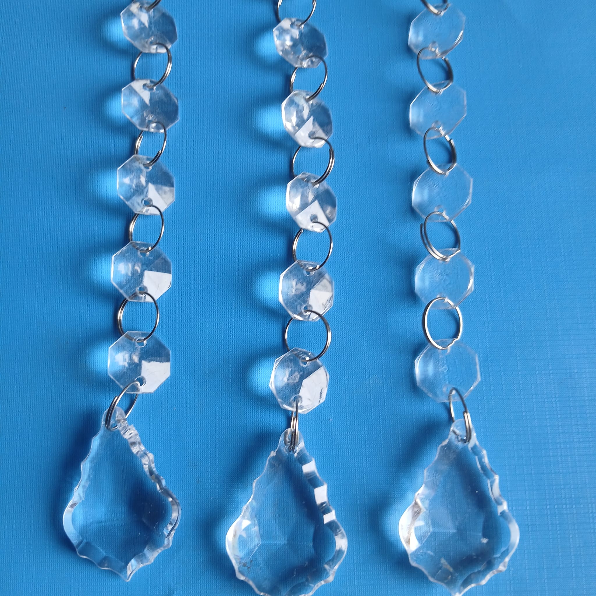 Křišťálově, průhledné přívěsky jsou zhotoveny z akrylu, vybroušeného tak, aby dělaly odlesky na vánočním stromečku a třpytily se. Na spodní části je vybroušená kapka do trojúhelníku, nahoru je navěšeno 6 akrylových diamantů. Ukončeno zlatou stužkou na zavěšení na vánoční stromeček.