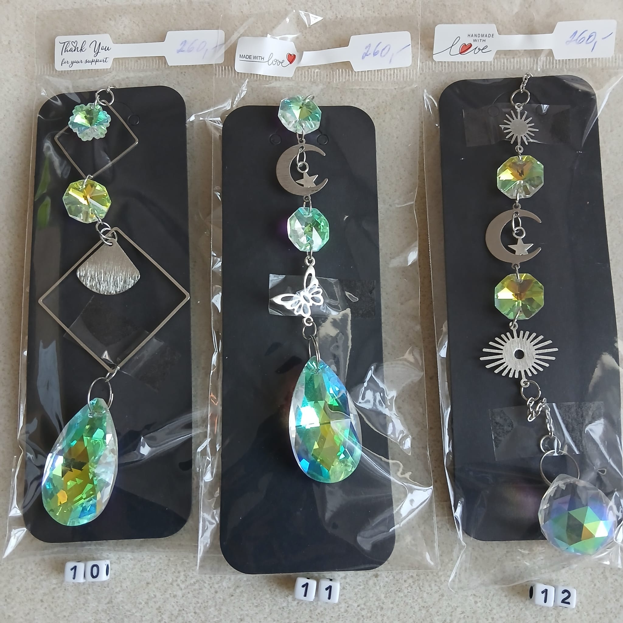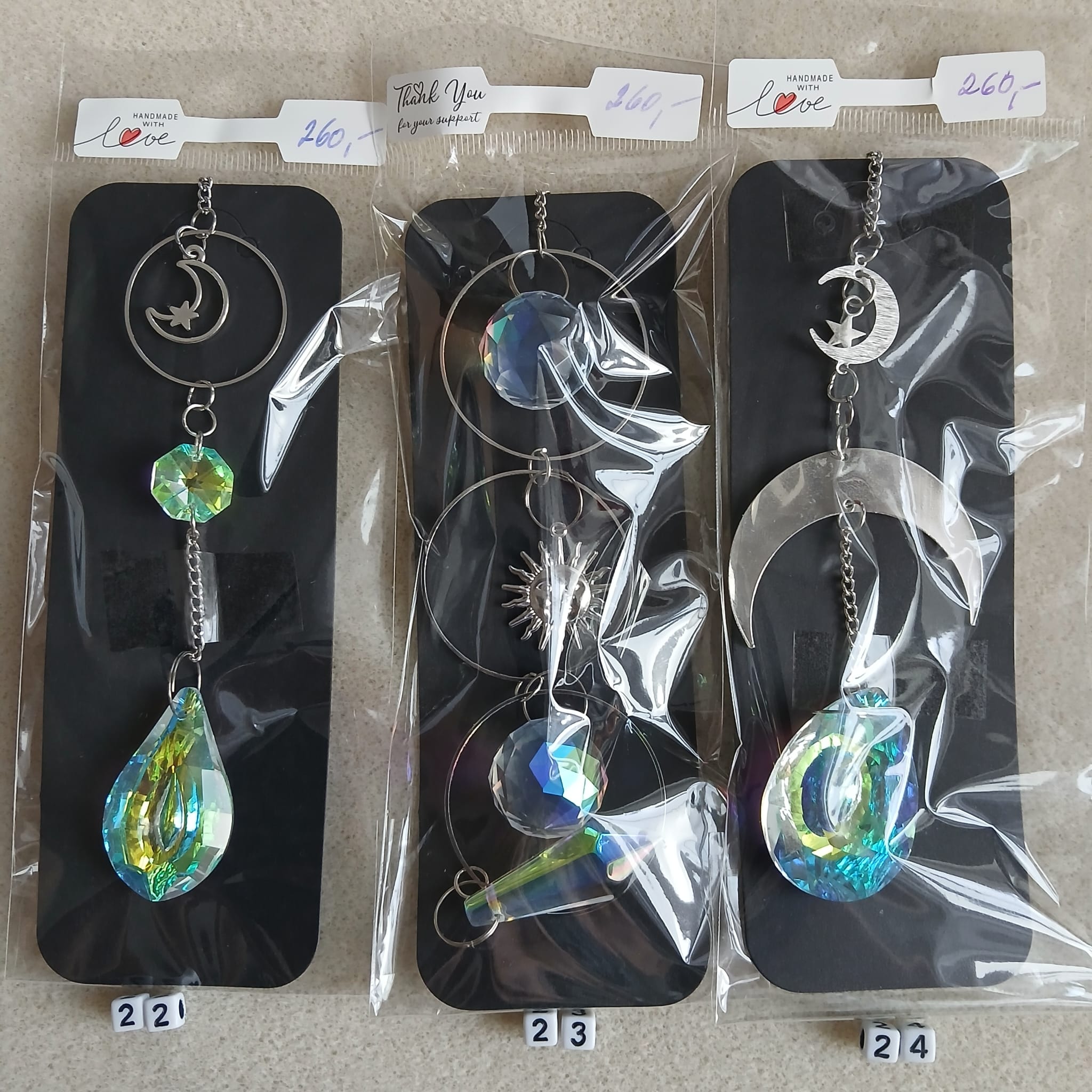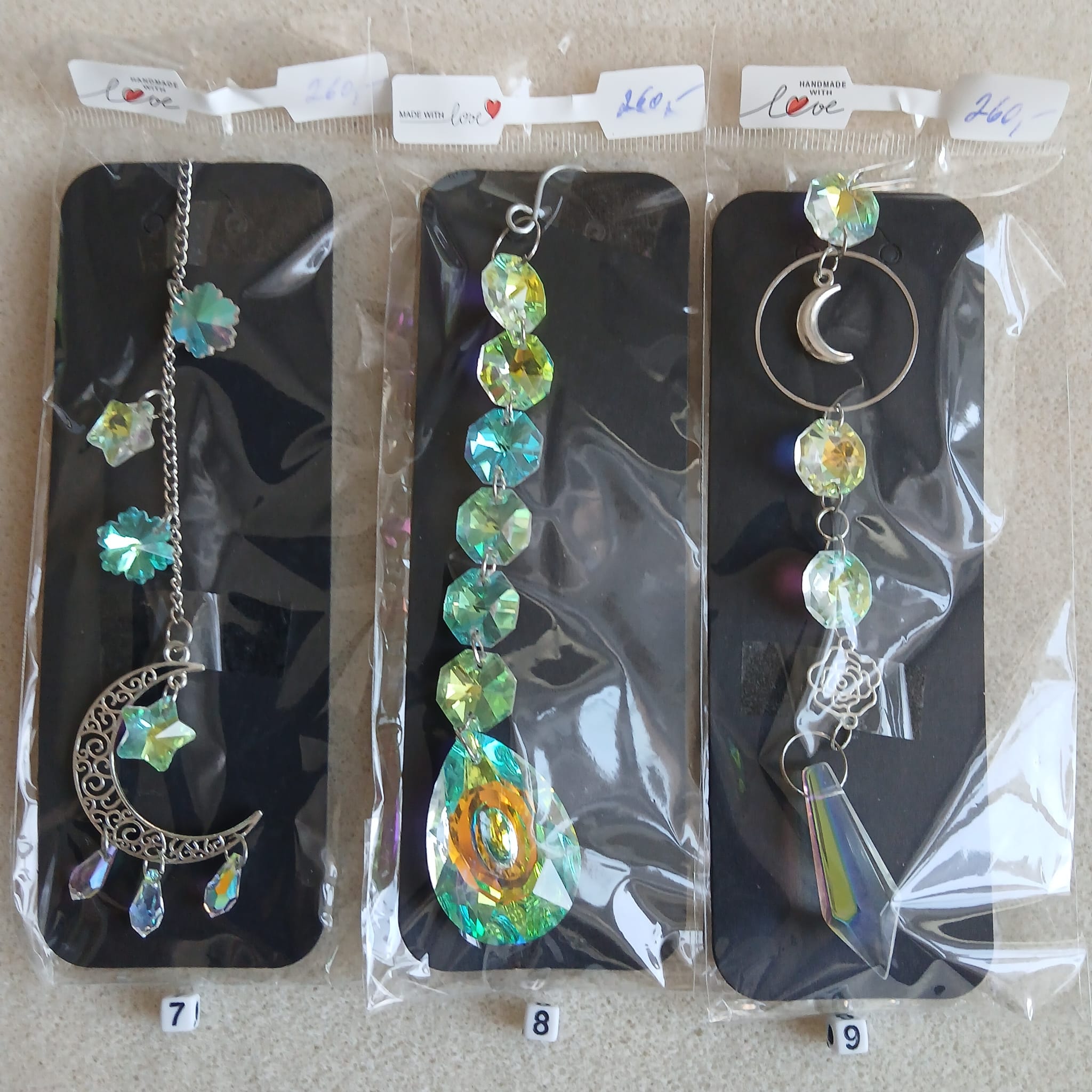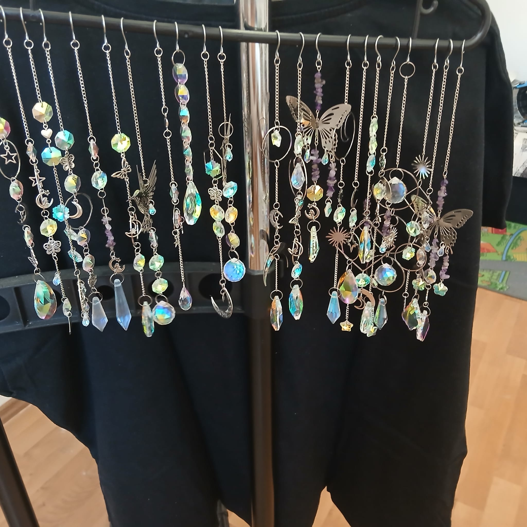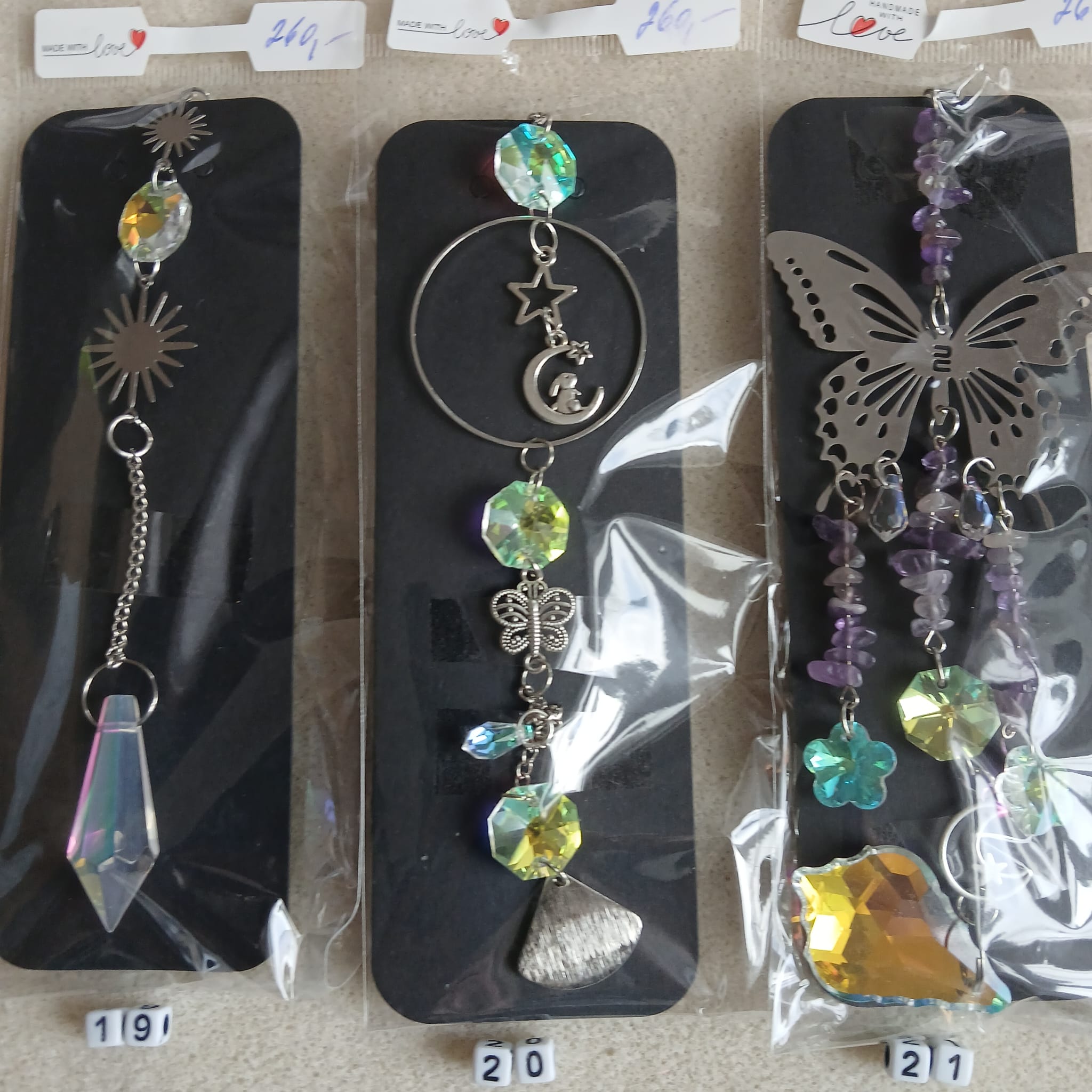 Zhotovili jsme „Lapače slunce“, které Vám ozvláštní jeho pověšením na záclonu, okenní rám nebo lustr místnost. Jsou použity kovové komponenty stříbrné barvy, které zdobí přívěsek. Přívěsek má háček na jeho pověšení. Použity jsou také ozdobné přívěsky z křišťálu, které jsou různě broušené, aby dělaly různobarevné odlesky podle toho, jak a kdy na něj bude dopadat sluneční světlo.