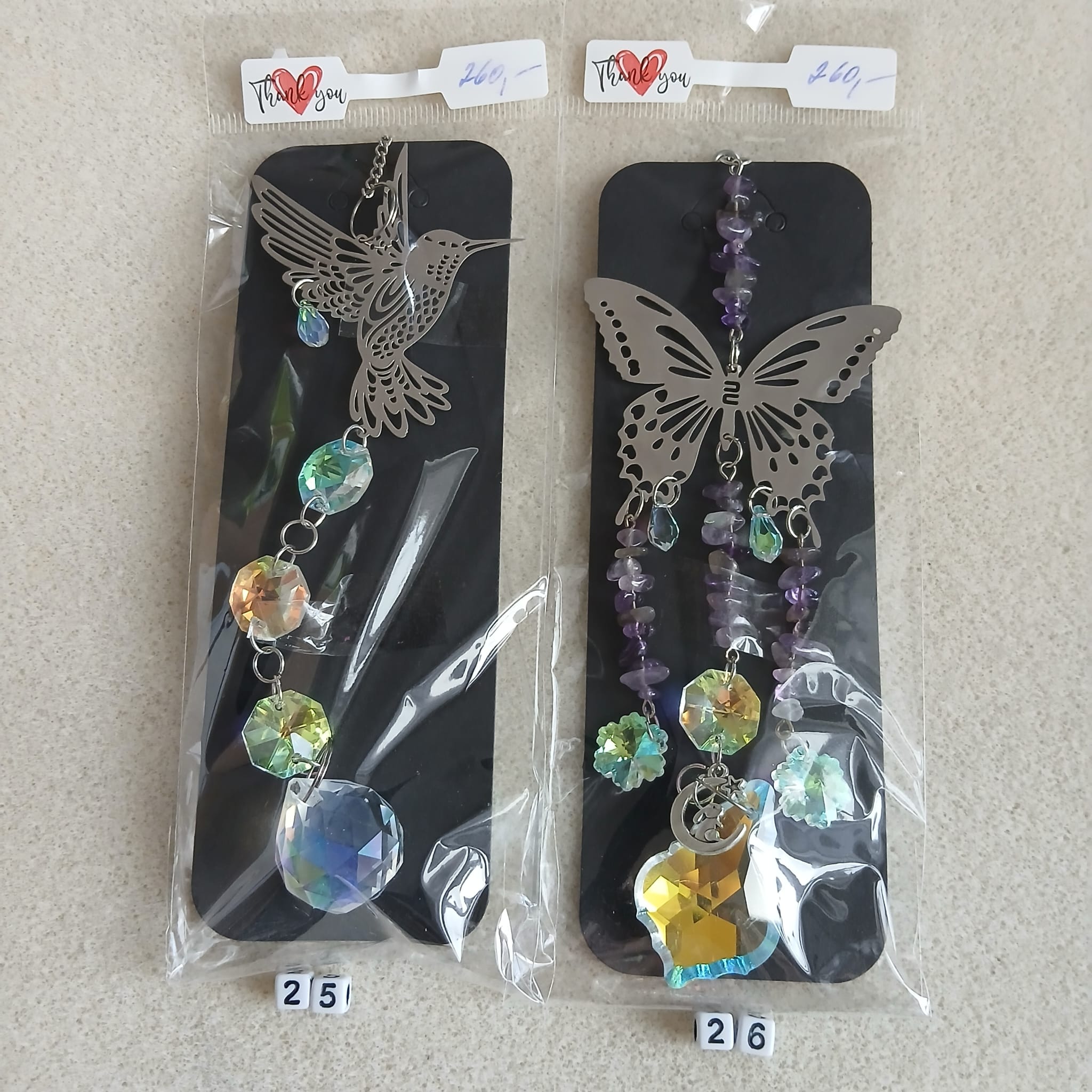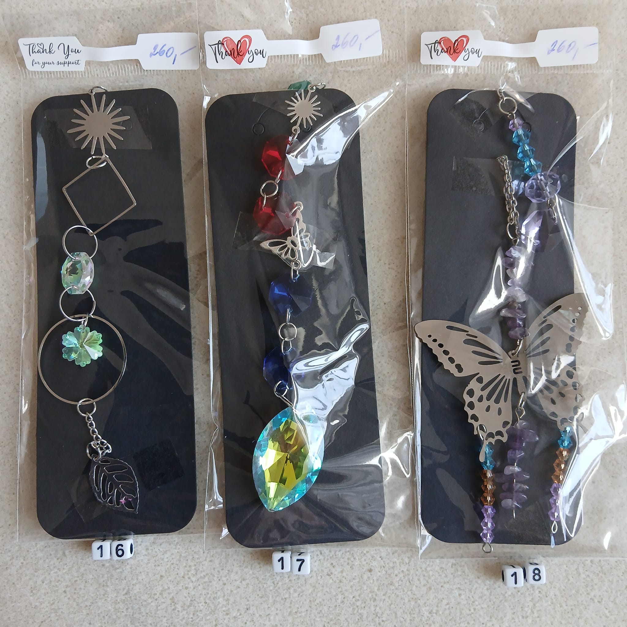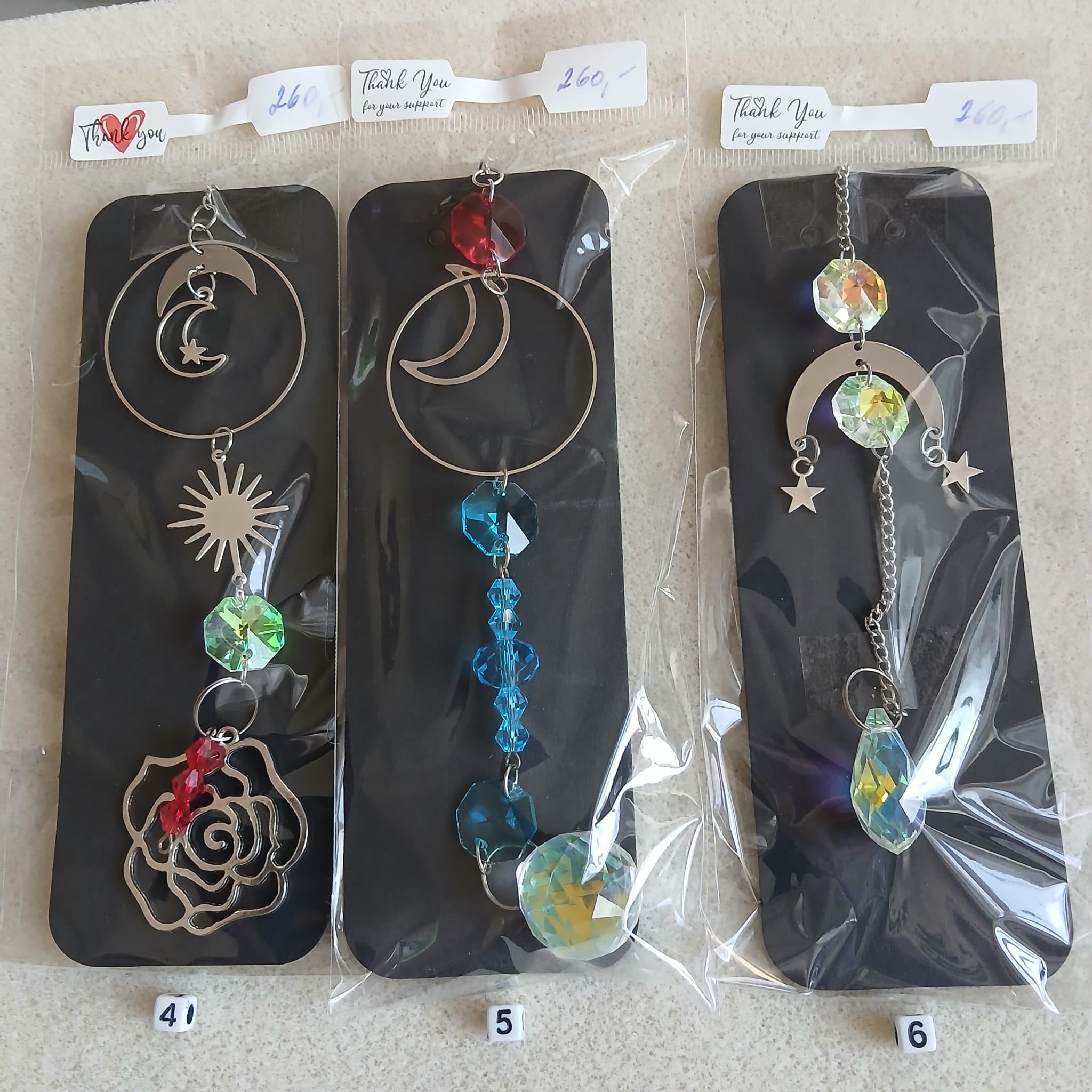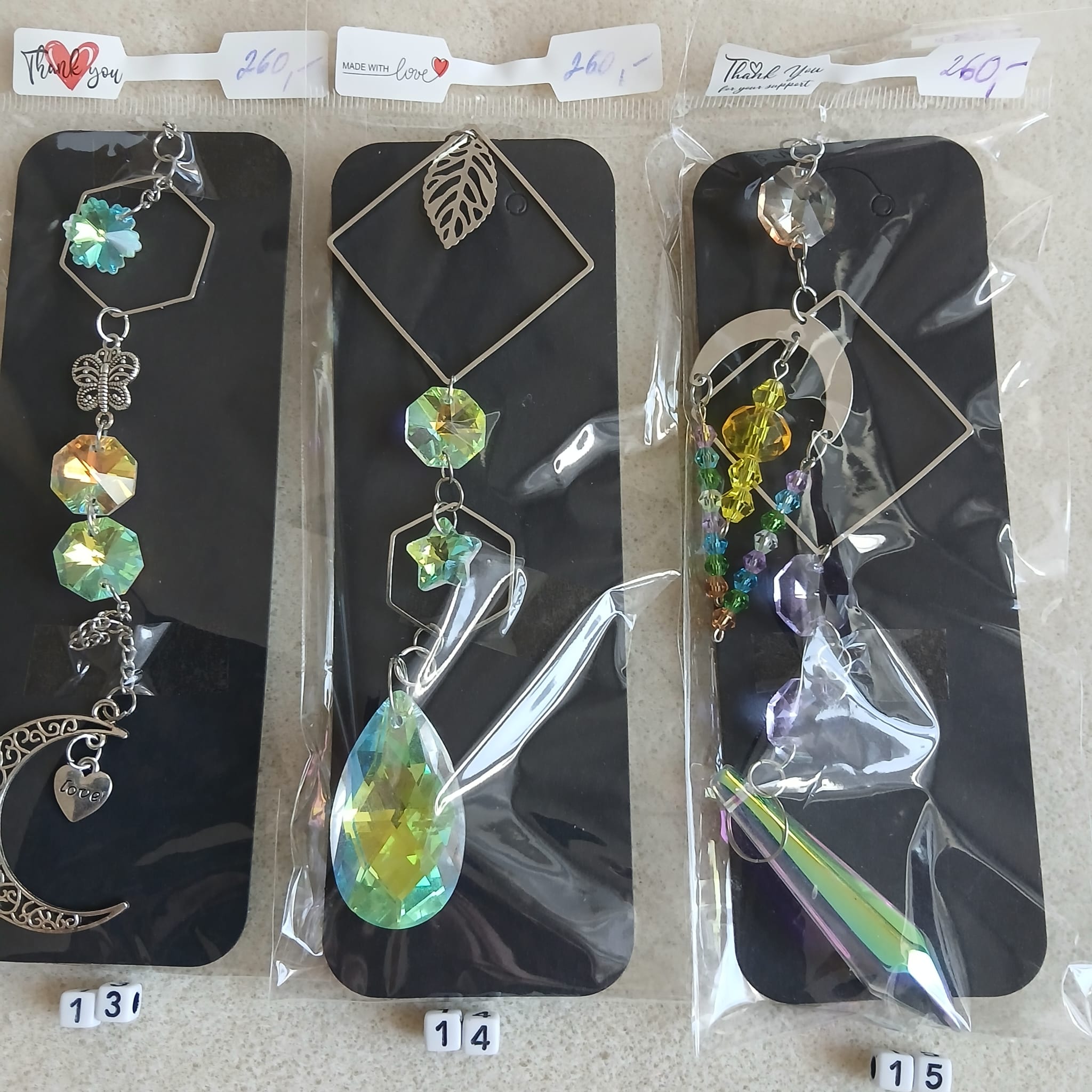 Na fotografiích je každý lapač označen příslušným číslem. Vyberte si ten co se Vám líbí, každý je originál a číslo napište do poznámky objednávky. Délka přívěsku od háčku až dolů je cca 30cm.