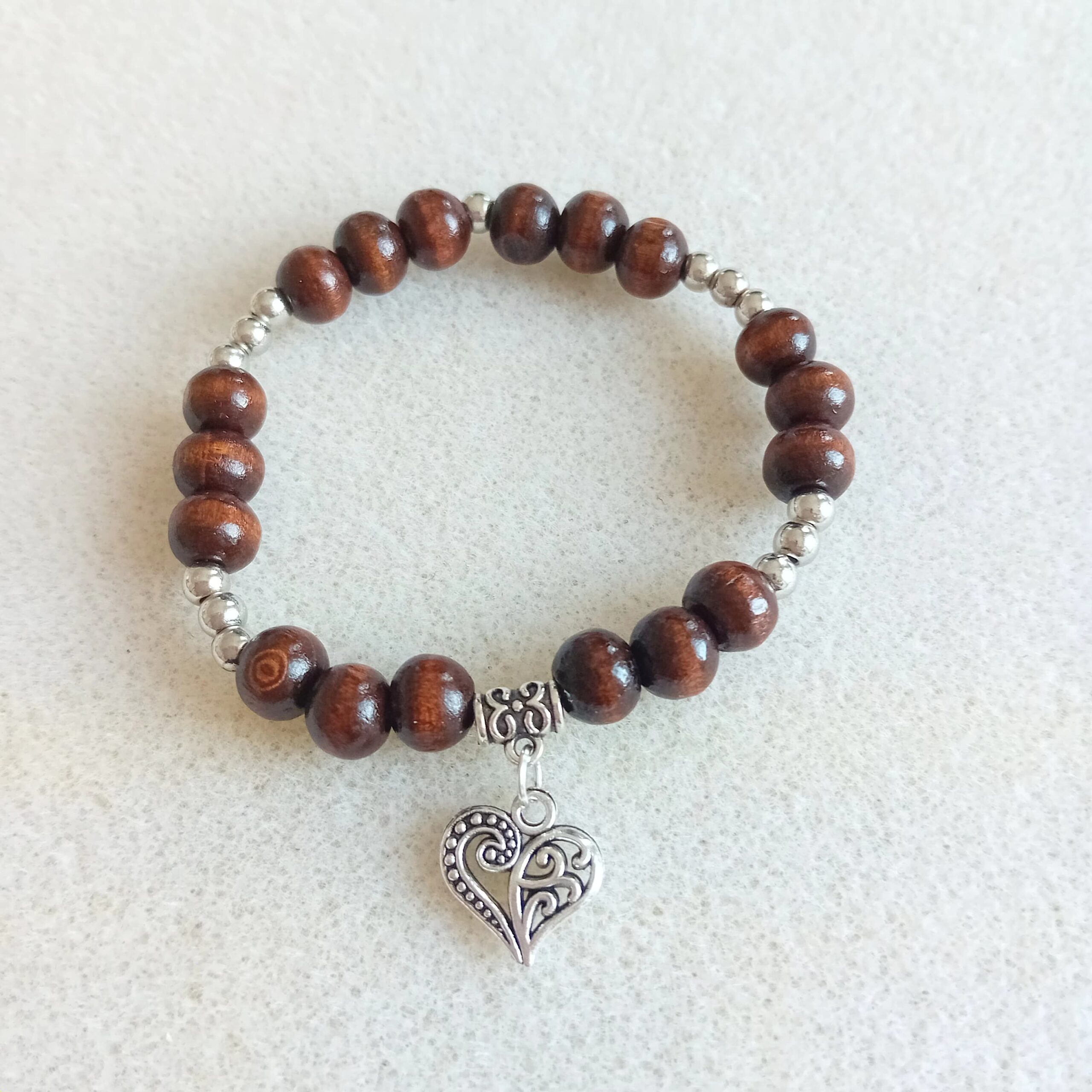 Souprava šperků se skládá z náhrdelníku a náramku z dřevěných korálků. Šperk zdobí kovové komponenty barvy stříbra, korálky, srdíčko zdobí strom života. Barva korálků je temně hnědá. Délka náhrdelníku je 46 cm, zapíná se na karabinku. Korálky na náramek jsou navlečeny na gumičku.