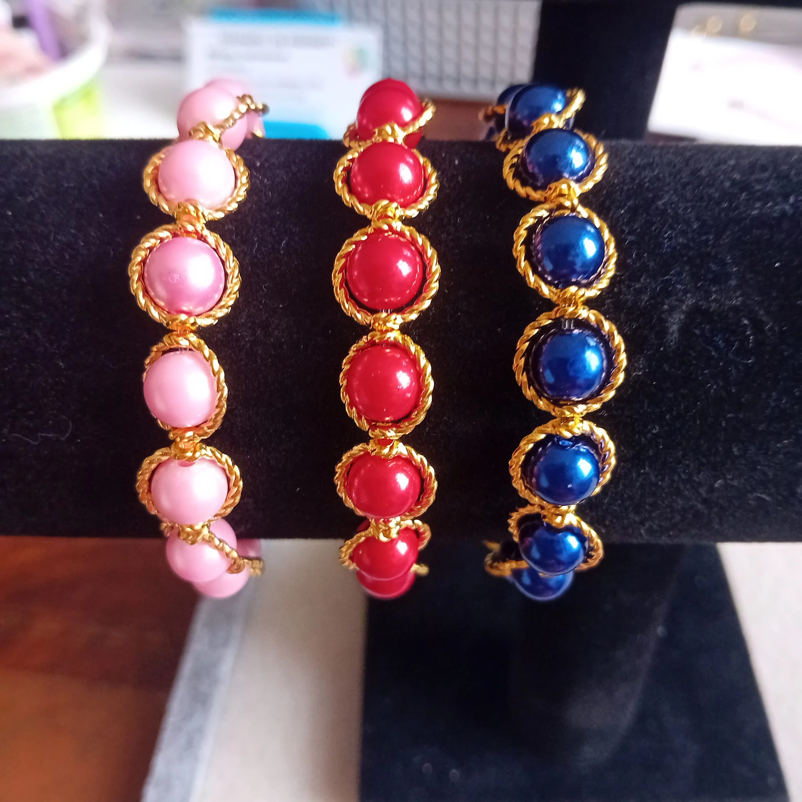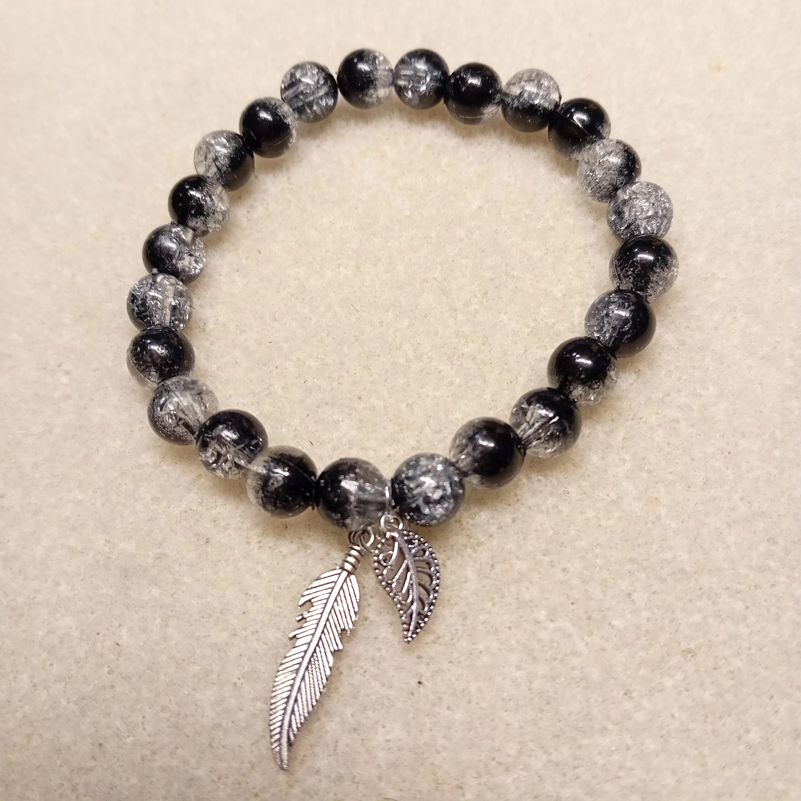 Náramek je zhotoven z akrylových korálků pestrých barev, korálky jsou zasazeny do točených kroužků a to buď barvy zlaté nebo stříbrné. Dále náramek v černo-stříbrné barvě s přívěsky lístečků. Korálky jsou navlečeny na gumičku. Hodí se ke společenským akcím.