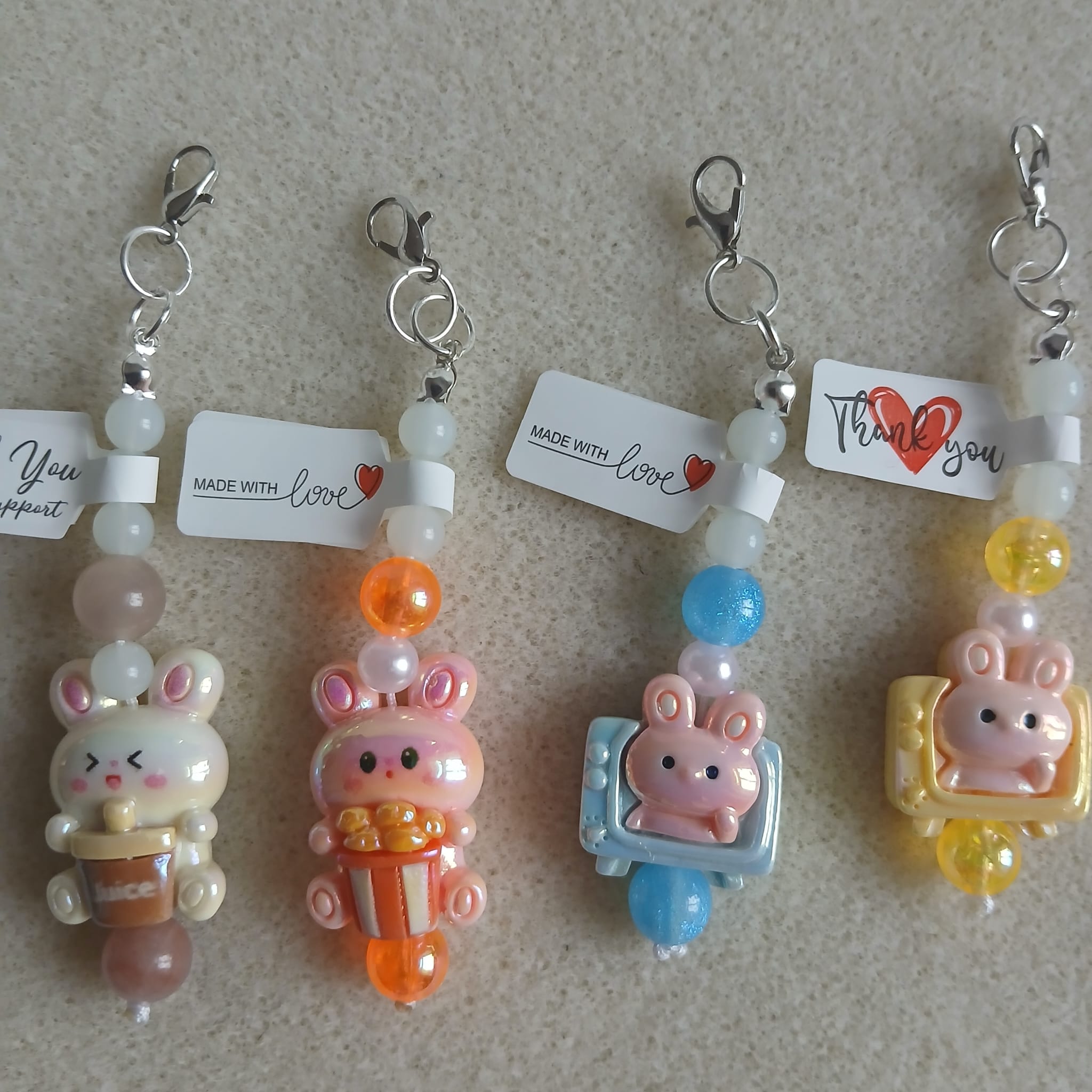 Figurky „Happy Rabbit“ jsou ručně malované.  Přívěšek se skládá z této figurky, spolu s ketlovanými korálky příslušné barvy. Korálky jsou některé skleněné, některé z pravých kamenů. Přívěsek je upevněn na drobné karabince. Vyrobeny ve 2D, z pryskyřice pro výrobu šperků. Veselý přívěsek  zavěsíte na tašku, kabelku, batoh, klíče, apod. Vhodné jak pro děti.