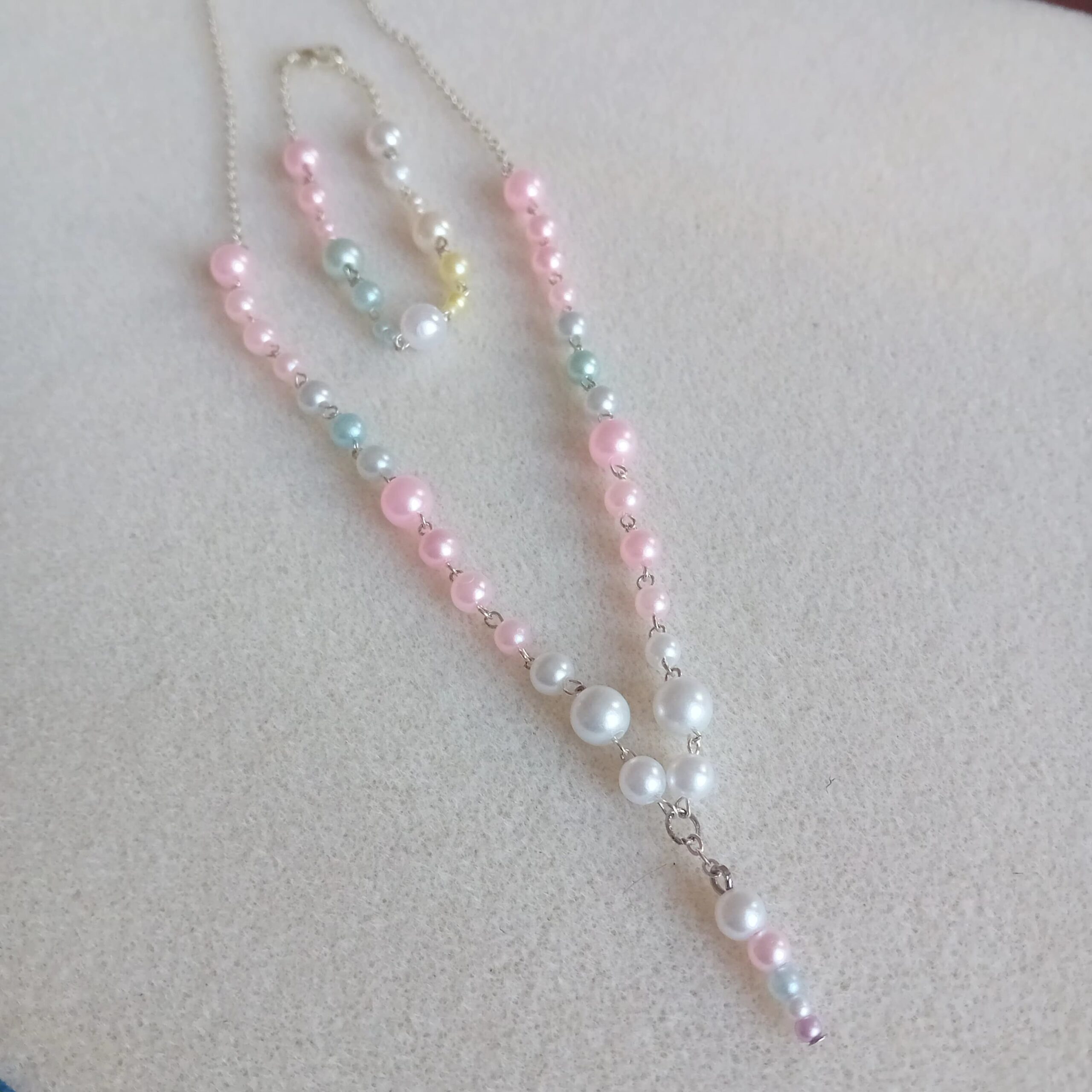 Souprava se skládá z náhrdelníku a náramku. Souprava je zpracována  metodou ketlování, tj. spojování jednotlivých korálků jehlami a využití kovového řetízku v barvě stříbra. Perličky jsou akrylové, v pastelových barvách růžové, bledě modré, žluté a bílé. Náhrdelník je dlouhý 56 cm, náramek měří 20 cm. V případě zájmu je možné délku obou šperků upravit dle přání zákazníka.