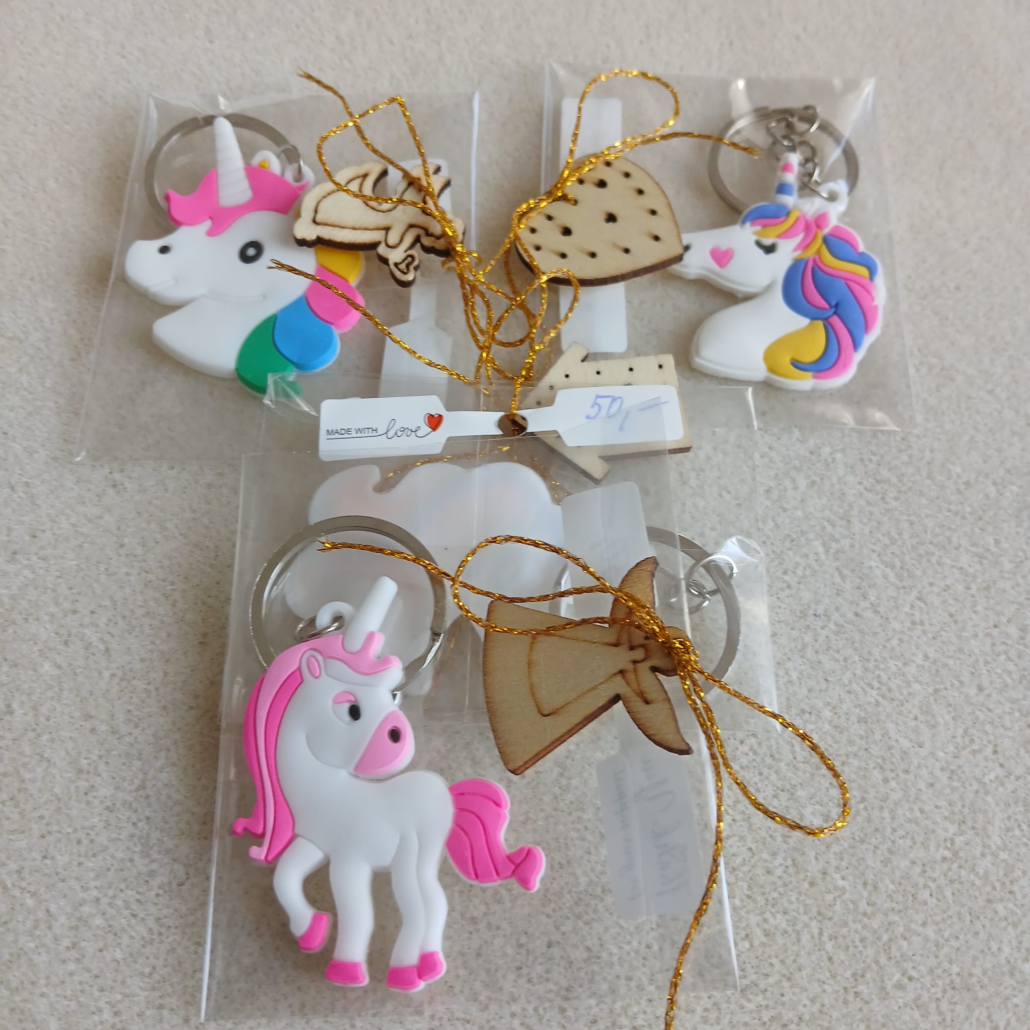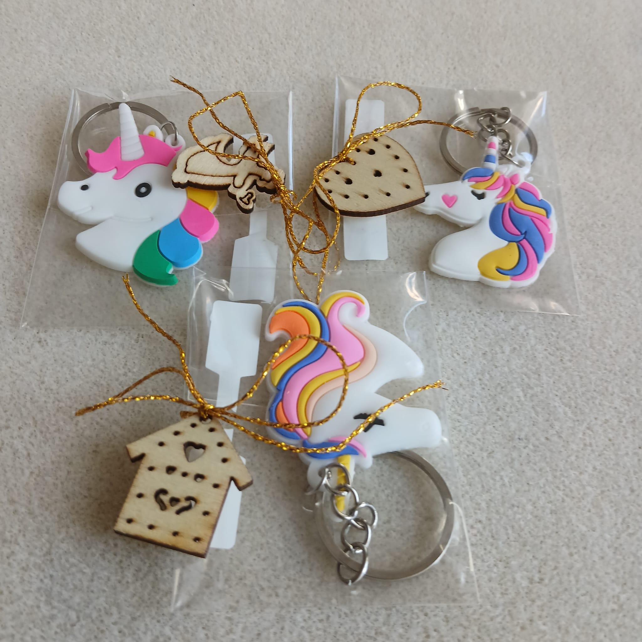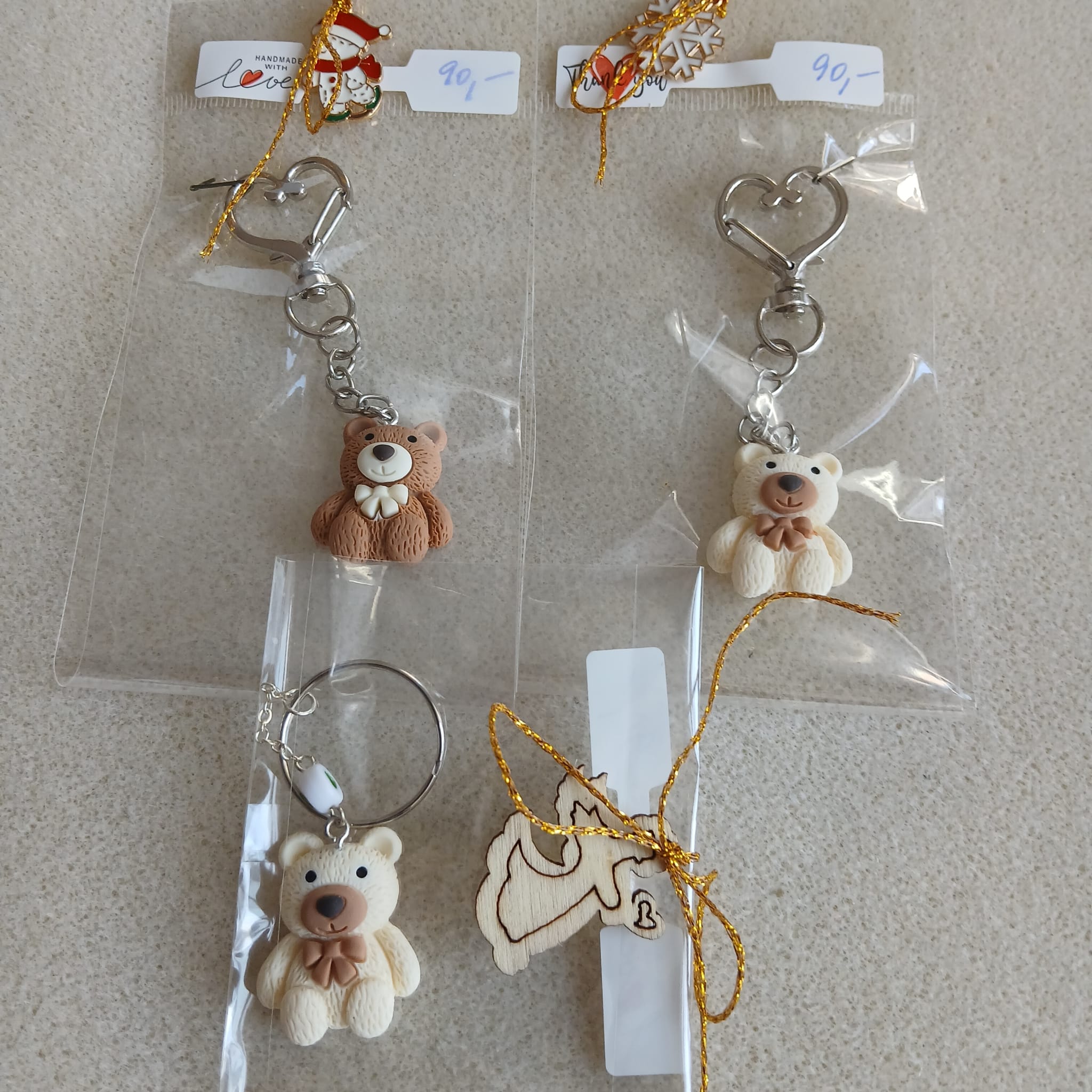 Přívěsky jsou zhotoveny z akrylu a gumy. Postavičky i zvířátka jsou hezké zpestření a radost pro děti na uchycení na batoh, klíče a pod. Všechny přívěsky jsou zabaleny do celofánového sáčku s uvázaným provázkem a kovovým nebo dřevěným přívěskem s motivem vánoc.