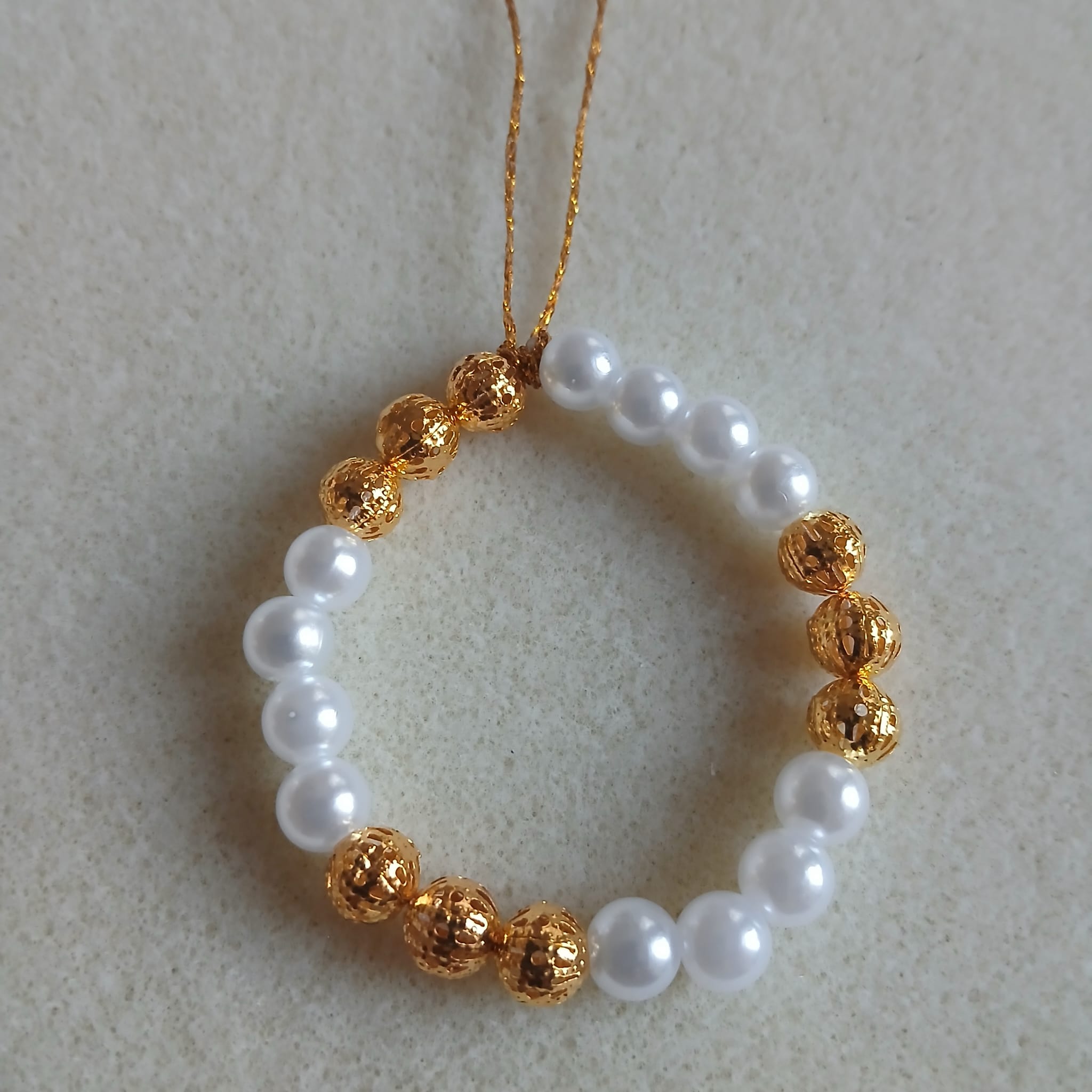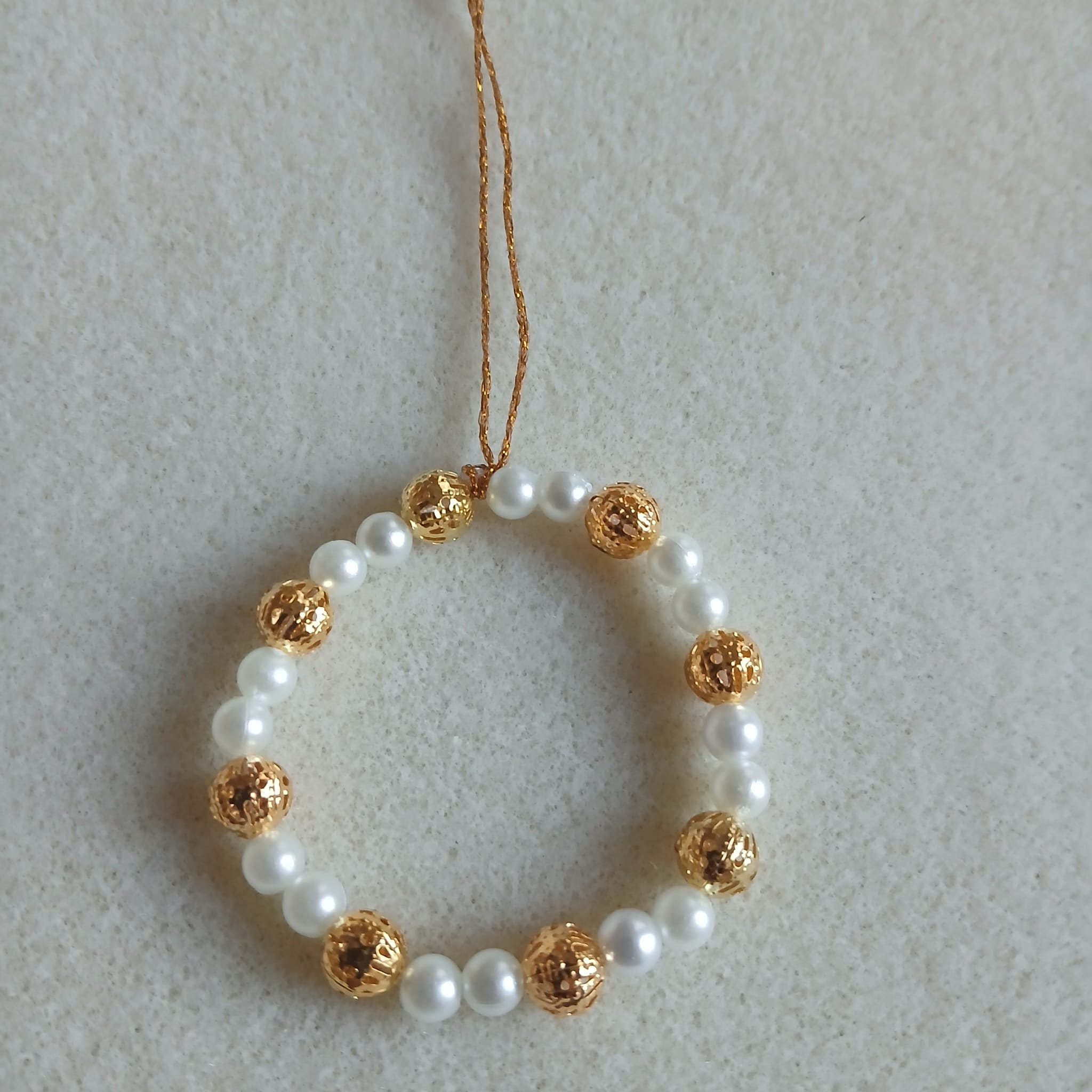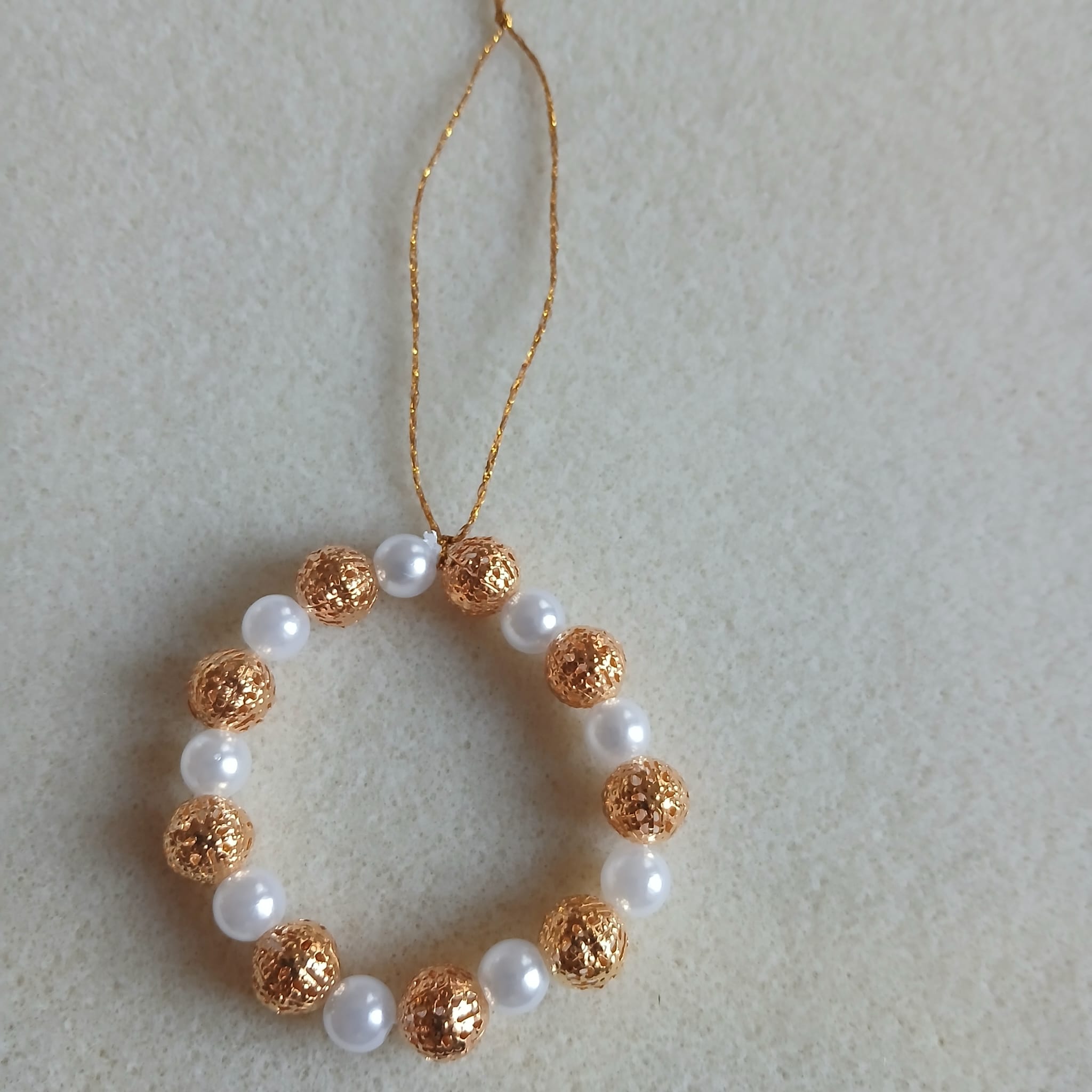 Věnečky z bílých a zlatých korálků, které jsou šité. Bílé korálky jsou perličky, zlaté jsou ze zlatého plíšku, ozdobeny dírkováním ornamentů. Jsou upevněny na zlaté niti pro zavěšení na stromeček nebo jako dekorace. Průměr věnečku je 4,5cm.